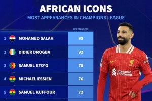 本轮能否出战?非洲球员欧冠出场榜:萨拉赫93场居首,德罗巴92场