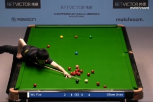 斯诺克冠军联赛第六小组第一比赛日,中国球员吴宜泽3-1战胜奥利弗·莱恩斯,第三局比赛,吴宜泽打出生涯首杆147。