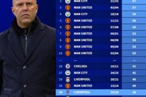 在英超历史上,本赛季的利物浦位居最糟糕的卫冕冠军之列,红军在23轮之后的积分仅仅高于1995-96赛季的布莱克本(35分)、2015-16赛季的切尔西(28分)、1992-93赛季的利兹联(28分)以及2016-17赛季的莱斯特城(21分)。