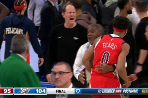 GIF-雷霆鹈鹕比赛都结束了 双方爆发冲突 多特费尔斯互掐 费尔斯多次冲锋被拦