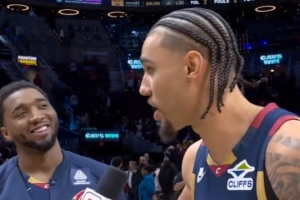 体育资讯1月29日讯 NBA常规赛,骑士主场129-99大胜湖人,赛后米切尔接受场边采访。