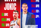 约基奇没有出场16场比赛,掘金场均得分108.8分,24.3助,命中率45.6%,三分37.5%。