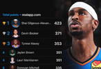 亚历山大13场比赛中有7场三节打卡,但这样他依旧是领先总得分榜!