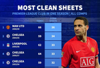 德转列英超球队单赛季各项赛事零封榜: