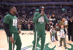 直播吧2月7日讯 在今日雄鹿对阵步行者的赛前。波蒂斯携手字母哥哥向字母哥致敬,并祝他连续10次进入全明星阵容。