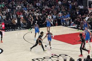 今晚开拓者对阵雷霆,这是一场艰难的比赛。开拓者从第一节开始就陷入落后。作为卫冕冠军,雷霆的突破流畅、三分轻松写意。即便开拓者以防守见长,在面对这支来自俄克拉荷马的冠军球队时,也显得力不从心。第一节结束后,开拓者已落后雷霆20分。比分41-21。