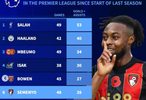 利物浦的萨拉赫49场53球居首,曼城的哈兰德42场40球排名第二。冬窗可能离开伯恩茅斯塞梅约以48场26球排名第六位。