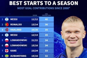 新世纪赛季开局参与进球最多榜:哈兰德本赛季已35球,仅次梅、罗