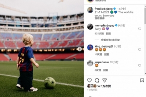 德容的儿子迈尔斯迎来2岁生日,德容社媒晒出迈尔斯在诺坎普球场的照片,配文:“2023年11月21日,这世界属于你,爱你。”