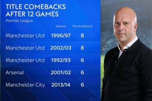 据天空体育统计,第12轮落后榜首6分或更多最终夺冠,英超历史只出现过5次这样的情况。