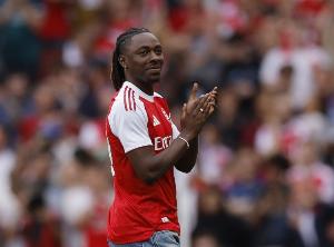 第41分钟,枪手右路传中被解围,赖斯不停球直传,埃泽面对多人防守晃开角度抽射破门。