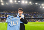 #曼城[超话]# 欧冠联赛阶段第5轮曼城主场迎战勒沃库森,斯诺克世锦赛冠军赵心童现场观赛,获赠号码为“147”的曼城球衣,并在社媒为曼城加油:“Come on City!!!😎”