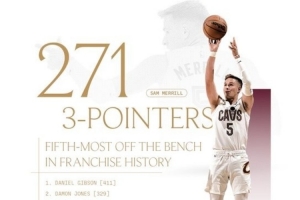 体育资讯11月8日讯 骑士官方发布纪录,梅里尔以替补身份命中率271记三分,超越科沃尔排名骑士队史第五。