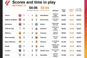 西甲本轮净比赛时间排行:赫罗纳1-1皇马62分26秒第一