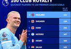 德转统计了球员完成英超百球最少场次排行榜。