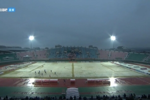 本场比赛,延边龙鼎主场积雪严重,草坪都被染成了白色。