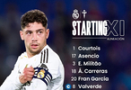 皇马首发:1-库尔图瓦、8-巴尔韦德、17-劳尔-阿森西奥、3-米利唐、18-卡雷拉斯、20-弗兰-加西亚、14-楚阿梅尼、15-居莱尔、5-贝林厄姆、7-维尼修斯、10-姆巴佩