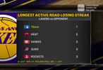赛前湖人转播商晒出一组数据,列举湖人目前面对不同对手的最长客场连败纪录: