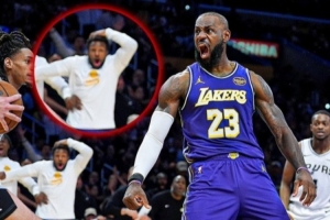 詹姆斯惊天隔扣科内特 场边的布朗尼被惊出表情包😱
