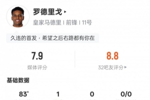 体育资讯12月15日讯 2025-26赛季西甲第16轮,皇马对阵阿拉维斯,罗德里戈首发出战,打进1粒进球,1次过人成功,传球成功率达到96.7%,评分7.9。