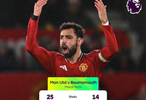 本场比赛,曼联完成25次射门(上半场17次),其中9次射正,最终打入4球,同样打入4球的伯恩茅斯此役完成14次射门,同样9次射正。