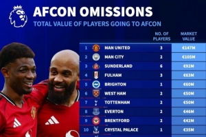 体育资讯12月17日讯 非洲杯即将战火重燃,《转会市场》也统计了因为要参加非洲杯而离队的英超各队身价损失榜,曼联居首。
