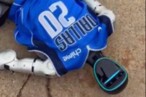 视频中一个穿着独行侠球衣的机器人正在施展回旋踢等招数,欧文溜过来使劲推了一把,机器人应声倒地没了动静。