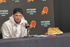 体育资讯12月19日讯 NBA常规赛,太阳主场99-98击败勇士。本场比赛,库里穿着了布克的签名鞋Book 1进行比赛。