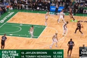 第四节比赛,杰伦·布朗通过上篮得到个人本场第30分,生涯总得分达到12196分,超越汤米·海因索恩,排名凯尔特人队史第13位。