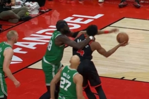 GIF-巴恩斯被科塔拉下随手一抛命中,主裁判经回放判定一级恶意犯规