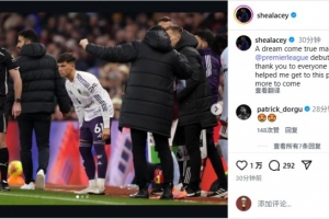 体育资讯12月23日讯 曼联青训小将谢伊·莱西在社交媒体发文,对完成英超首秀表示感恩。