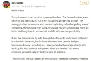 今天真的是让我感到难过,离别总是来得那么突然,让人措手不及。我不仅仅是在向一位主教练告别,更是在向一位给我留下深刻印记的人告别,他改变了我的比赛方式、思维模式乃至日常生活。您提升了我的竞技水平,激励我变得更好,并教会我带着更多责任感看待足球和生活。
