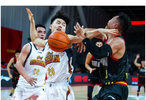 12月24日,四川丰谷酒业队球员张高铭(前左)防守深圳马可波罗队球员贺希宁(前右)。