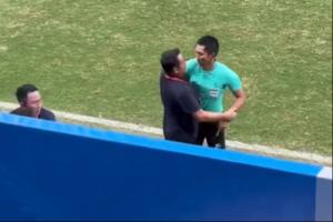 现场实拍视频显示,马宁准备向云南队替补席的人员出示黄牌,随后见到被出示黄牌的人员继续抗议裁判,迅速跑到场边。云南队主教练立即试图拉住马宁,但马宁最终还是出示红牌将云南替补席上的工作人员红牌罚下。