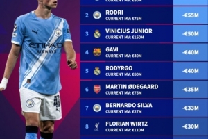 体育资讯12月29日讯 2025年即将结束,德国转会市场盘点了这一年足坛身价下跌最多球员,福登下跌6000万欧元居首,罗德里下跌5500万欧元次之,维尼修斯下跌5000万欧元位居第三。