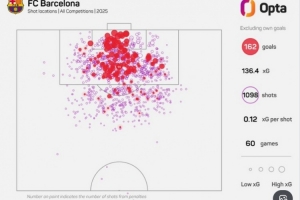 体育资讯12月31日讯 据数据网站OPTA统计,巴萨在2025年60场各项赛事共计打进169粒进球(包括乌龙球)。