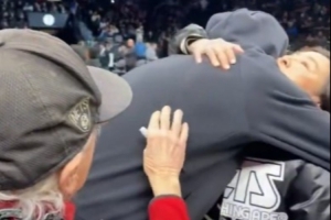 赛前,杜兰特与篮网死忠老球迷Mr Whammy亲切交流,并拥抱了蔡老板夫人吴明华。
