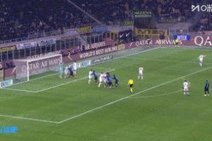 比赛第74分钟,国米右侧角球机会,图拉姆门前用肩膀将球撞进球门!