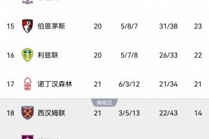 此役过后,西汉姆21轮14分位列倒数第三,身前的森林21轮21分倒数第四。