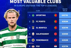第一:葡萄牙体育/葡超,4.57亿欧元。