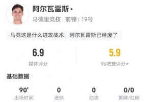 体育资讯1月9日讯 马竞在本轮西超杯对阵皇马,阿尔瓦雷斯本场数据如下: