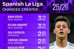 体育资讯11月12日讯 Squawka统计本赛季西甲创造机会次数,居莱尔、姆巴佩32次最多。