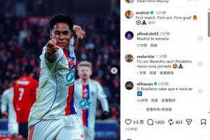 恩德里克冬窗被皇马外租至里昂,他首次为里昂出场就斩获进球,赛后恩德里克社媒晒出庆祝进球的照片,配文:“首秀、首胜、首球!”