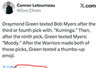 德雷蒙德格林在第三或第四顺位选秀结束后给鲍勃·迈尔斯发短信说:“库明加”。然后,在第九顺位选秀结束后,格林又给迈尔斯发短信说:“穆迪”。勇士队完成这两次选秀后,格林发了一个点赞的表情符号。